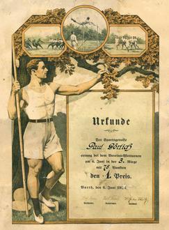 „Der Sportsgenosse Paul Görlich errang bei dem Vereins-Wetturnen am 6. Juni in der 3. Riege mit 78 Punkten den 1. Preis. - Barth, den 06. Juni 1926 - Karl Lorenz, Vorsitzender. - Karl Panitz, Kampfrichter. - Wilhelm Schultz, Turnwart“