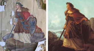 links: Fahne des MTV Barth / rechts: Lorenz Clasen: „Germania auf der Wacht am Rhein“, 1860