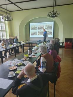 Jens Gablowsky informierte gezielt über die Geschichte, den Zustand und die denkmalschützerischen Anforderungen für das Mahnmal KZ Außenlager Barth Süd. Sein bebilderter Vortrag fand nicht nur viel Anklang, eine der Anwesenden konnte sich beim Anschauen der Fotos sogar erinnern, wie sie als Kind an einem der Gedenktage dort beteiligt war. Es braucht nicht nur viel Geld, sondern auch eine Menge an Vorbereitungen und Abstimmungsprozessen, die Beantragung von Fördermitteln inbegriffen, um die dringend erforderliche Turmsanierung durchführen zu können und das Mahnmal in einen würdigen Zustand zu versetzen.
