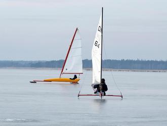 Bei fünf Minusgraden und Windstärke fünf aus Südost fühlte sich das Nachmittagswetter wie minus 15 Grad an. In Böen mussten die Segler sogar aufpassen, ihre Schlitten nicht „kentern“ zu lassen. Teilweise refften sie deshalb die Segel oder fuhren zu zweit. Trotzdem kamen die schwerfälligen einstigen Arbeitsschlitten nicht an die auf Geschwindigkeit getrimmten DN-Schlitten heran, die etwas weiter entfernt ihre rasanten Bahnen zogen.