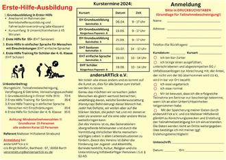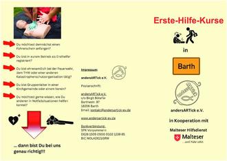 In Kooperation mit dem Malteser Hilfsdienst Stralsund bietet andersARTick e.V. in diesem Jahr mehrere Erste-Hilfe-Grundkurse an. Die Grundkurse sind geeignet für die Fahrschule/Führerschein, für Betriebsersthelfer, für ehrenamtliche Mitarbeiter in Vereinen und anderen Organisationen, für Lehrkräfte und für alle sonstigen Interessierten.