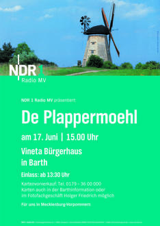 Der NDR1 Radio MV präsentiert gemeinsam mit dem Barther Heimatverein e.V. und der Stadt Barth am 17. Juni 2024 "De Plappermoehl" im Vineta-Bürgerhaus.