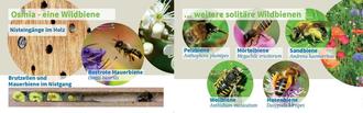 Die solitären Wildbienen leben nicht in Staaten, sondern einzeln, und die Weibchen versorgen ihre Nachkommen mit Pollen und Nektar. Die meisten Arten übrigens im sandigen Erdboden, und nicht in der Bienennisthilfe Stapel aus Totholz, das über die Jahre morsch werden kann, eignen sich hingegen für selbstgenagte Nester. Zum geeigneten Nistplatz gehört für die Wildbienen unbedingt das passende Nahrungsangebot. Sie können sich am besten fortpflanzen, wenn das Blütenangebot mit Nektar und Pollen über den gesamten Frühling und Sommer ausreicht. Selbst in Dörfern mit Hausgärten mangelt es ab Juli daran. Grund genug, um Biene Majas wilden Schwestern schon jetzt einen gedeckten Tisch vorzubereiten. Bereits im Blumenbeet, im Kräuter- oder Obstgarten ist im Gartenjahr so einiges für die Wildbienen möglich. Empfehlenswert sind „Bienenpflanzen“ wie Schnee-Heide, Lerchensporn, Lungenkraut, Rote Johannisbeere, ungefüllte Wildrosen, Bärlauch, Maiglöckchen, Brombeere, Himbeere, Salbei, Beinwell, Zitronenmelisse, Margerite, Blut-Weiderich, Baldrian, Dill, Drüsige Kugeldistel, Garten-Katzenminze, Malven, Natternkopf, Wilde Karde, Große Königskerze, Pfefferminze, Glatt- und Raublattaster.