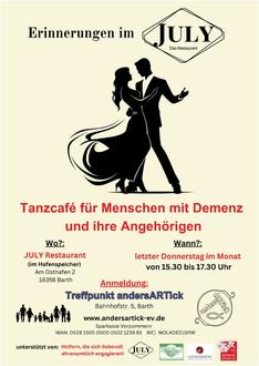 Gemeinsam mit dem Restaurant “JULY” im Barther Speicher lädt andersARTick e.V. an jedem letzten Donnerstag im Monat von 15.30 Uhr bis 17.30 Uhr Menschen mit Demenz und ihre Angehörigen ein, beim Tanzcafé “Erinnerungen im JULY” in einem geschützten Rahmen eine schöne Zeit zu erleben. Musik weckt Erinnerungen und bringt Menschen in Bewegung. Der Kontakt zu anderen kann leichter aufgebaut werden. Ohne Angst vor unverständlichen Blicken oder Reaktionen gibt es Gelegenheit, das gesellschaftliche Leben trotz Demenz wieder neu zu entdecken. Die Betroffenen und ihre Angehörigen dürfen sehen, dass es anderen Menschen ähnlich geht und auf Wunsch in den Austausch miteinander kommen.