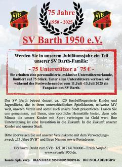 Der traditionsreiche Fußballverein SV Barth 1950 e.V. feiert in diesem Jahr sein 75-jähriges Bestehen. Der Verein, der seit seiner Gründung 1950 als feste Institution des regionalen Sports gilt, blickt auf eine bewegte Geschichte zurück und hat anlässlich des Jubiläums eine besondere Spendenaktion ins Leben gerufen: "75 Unterstützer á 75 €".