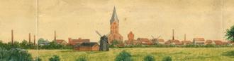 Dieses künstlerische Kleinod, das bisher kaum der Öffentlichkeit präsentiert wurde, zeigt unsere altbekannte Stadtsilhouette und ihre Wahrzeichen: Der emporragende Kirchturm, das trotzige Dammtor und die damaligen Windmühlen vor der Stadt.