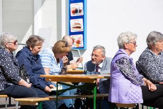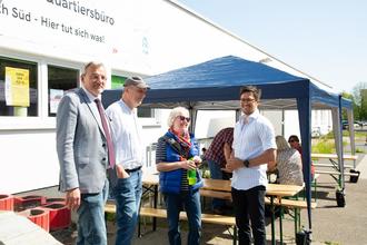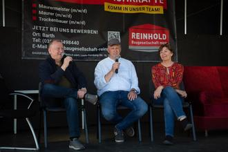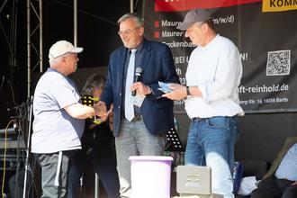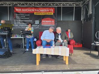 Ein Höhepunkt des Stadtteilfests war um 14 Uhr erreicht, gelang es doch, mit Bernd Zeller, Konrad Lanz, Mathias Löttge und Stefan Kerth gleich vier ehemalige Bürgermeister von Barth auf der Bühne zu präsentieren. In Einzelgesprächen auf dem roten Sofa, jeweils moderiert von Volker Reintjes, wurde der Wandel des Stadtteils als Vorzeigestadtteil mit Neubauwohnungen in den 80ger Jahren hin zu einem Stadtteil mit Entwicklungsbedarf heute zutage erkennbar. Viel Zustimmung vom Publikum erntete Bernd Zeller für seinen Wunsch, den Brunnen vor der Kaufhalle wieder instand zu setzen und zu einem Anziehungspunkt im Stadtteil werden zu lassen. Aufgelockert wurden die Gespräche durch Live-Musik des Duos „In Familie“, Kurt Dressler und Christine Harmatha. „Die kann wirklich singen“, staunte einer der Besucher.
