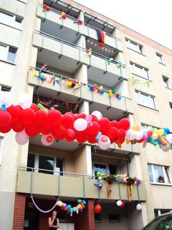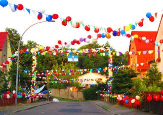 Vielleicht hängt da eine bunte Girlande über der Straße. Vielleicht tanzen Luftballons im Wind. Vielleicht hat jemand ein kleines Fähnchen in den Garten gesteckt. Vielleicht nur ein „Viel Spaß heute“-Schild am Gartenzaun.
