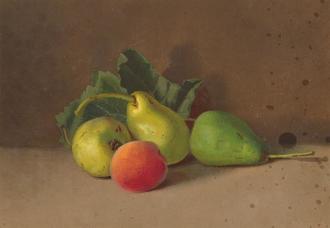 (Louis Douzette: Naturstudie Birnen und Apfel, unsign., undat., 230 x 307 mm, Deckfarben auf Papier)
