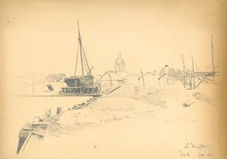 (Aufgedocktes Segelschiff auf der Barther Werft; sign. unten rechts, dat.: „Barth i. September 1883“, 320 x 469 mm, Bleistift auf Karton)
