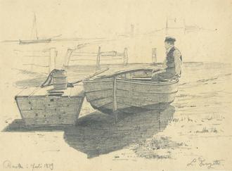 (Louis Douzette: Fischer im Boot neben Fischkasten; sign. unten rechts, dat.: „Barth i. Juli 1879“, 232 x 305 mm, Bleistift auf Karton)