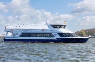 MS Stadt Barth, eines von zwei Schiffen, die zwischen Barth und Zingst fahren.