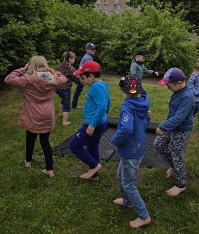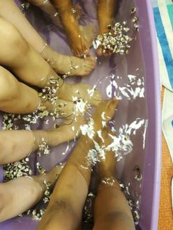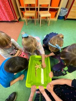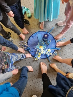 Die Kinder begannen alle gemeinsam mit einem erfrischende Tautreten im Garten- ganz so, wie es Kneipp einst empfohlen hat. Barfuß durchs nasse Gras zu laufen, war für viele ein besonderes Erlebnis. Doch das war erst der Anfang. In den Gruppen konnten die Kinder Stationen der Kneipp Elemente entdecken. BLAU - Symbol für das Wasser und zentrales Thema des Tages. Von Experimenten mit Wasser über eingefärbten Bastelschaum bis hin zu kunstvoll gestalteten Wassertropfen war für jedes Kind etwas dabei. Auch das berühmte Wasser treten durfte nicht fehlen und wurde mit viel Freude ausprobiert.