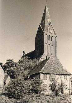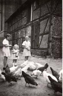 Einige historische Fotos zeigen diese Gebäude, so das Wirtschaftsgebäude rechts vom Papenhof mit dem Turm der Marienkirche im Hintergrund und Hühner fütternden Kindern im Vordergrund (Abb. 3, um 1950).