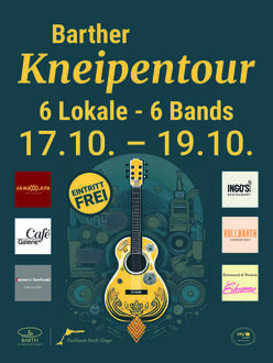 Die Barther Kneipentour kehrt in diesem Jahr zurück! Vom Freitag, 17. Oktober, bis Sonntag, 19. Oktober heißt es wieder: sechs Lokale, sechs Bands und jede Menge gute Laune. Neu im Programm ist das Galerie Café. Termin vormerken, Freunde einladen und die Nacht zum unvergesslichen Erlebnis machen!