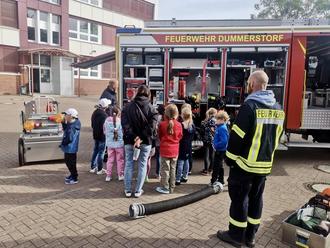 Wir haben viel über die Erste Hilfe gelernt und uns selbst einen Verband angelegt. Sehr spannend war auch die Station mit den Atemschutzmasken. Wir haben gelernt, dass bei einem Brand die Kinder keine Angst haben müssen. Vielen Kindern hat die Station mit dem Löschen sehr gut gefallen. Wir durften alle den Wasserschlauch selbst halten. Wir wissen jetzt auch, was alles zu einer Ausrüstung der Frauen und Männer und der Feuerwehrautos gehören. Rauchmelder sind ganz wichtig in jeder Wohnung. Sie können Leben retten.