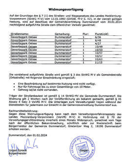 Träger der Straßenbaulast ist gemäß § 14 StrWG-MV die Gemeinde Dummerstorf. Die Widmung gilt 2 Wochen nach der Veröffentlichung als bekannt gemacht, gemäß § 41 Absatz 4 Satz 3 VwVfG M-V. Die Unterlagen zum Verwaltungsakt liegen während der Dienstzeiten für jedermann zur Einsicht in der Gemeindeverwaltung Dummerstorf aus.