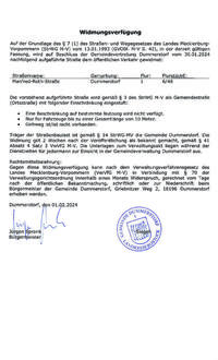 Auf der Grundlage des § 7 (1) des Straßen- und Wegegesetzes des Landes Mecklenburg-Vorpommern (StrWG M-V) vom 13.01.1993 (GVOBl. M-V S. 42), in der derzeit gültigen Fassung, wird auf Beschluss der Gemeindevertretung Dummerstorf vom 30.01.2024 nachfolgend aufgeführte Straße dem öffentlichen Verkehr gewidmet: