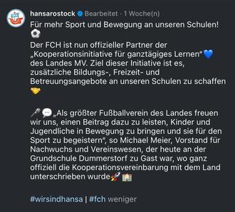„Mit großem Engagement erweitert der F.C. Hansa Rostock e. V. als Bildungspartner die Palette der Bewegungsangebote, die bei den Schülerinnen und Schülern überaus beliebt sind. Sie sorgen für einen Ausgleich zum Unterricht, trainieren Sozialkompetenzen und stärken die Teamfähigkeit der Kinder und Jugendlichen.“
