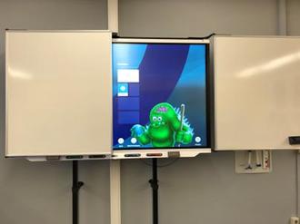 Die Tafeln besitzen in der Mitte einen interaktiven Bildschirm und links und rechts eine Whiteboard-Fläche. Bei den Tafeln sind farbige Stifte sowie zwei Schwämme dabei. Die Tafeln bieten zudem zahlreiche Funktionen, darunter z. B. Word und PowerPoint und diverse Lern-Apps (z. B. kahoot, die Anton-App).
