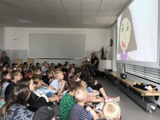 So bekam die Klasse am Montag Besuch von einem mit Technik vollgepackten Van. Als dieser gemeinschaftlich geleert war, begann die Arbeit. Zuerst wurde beschlossen, was in der Woche entstehen sollte. Da es immer mal wieder zu kleinen Streitigkeiten in der Klasse kommt, sollte das Thema "Wir" behandelt werden. Schnell wurden zwei Gruppen gebildet und diese erhielten den Auftrag, sich eine Geschichte zu diesem Thema zu überlegen. Jede Gruppe ging ideenreich und hoch motiviert an die Arbeit. Es wurde gezeichnet, ausgeschnitten, fotografiert, Figuren wurden geschoben, Geräusche produziert und jede Figur bekam eine Stimme. Zum Schluss bekam jede Geschichte noch einen Titel. Am Freitag waren dann zwei unterschiedliche Trickfilme im Kasten. In der Woche hatten die Schüler auch fleißig Eintrittskarten gebastelt, denn sie wollten das Ergebnis ihrer Arbeit allen Klassen zeigen. So präsentierten in der Cafeteria des Hortes in zwei Durchgängen die Schüler stolz ihre Werke, die mit viel Beifall belohnt wurden.