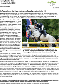 Annalena Elias konnte sich mit ihrer Schimmelstute Cascara auch am letzten Wochenende in Ludorf bei Röbel mit Platzierungen gut in Szene setzen. Wie bereits Anfang Mai in Wöpkendorf und Dummerstorf. Auch Sarah Marie Wilcken kehrte mit zwei Platzierungen auf Contan aus Ludorf zurück. Pia Nicole Sakriß, die in Brandenburg beheimatet ist, ritt am gleichen Wochenende in Rudow bei Berlin zu Sieg und Platz. Die Reiterinnen des Gastgebers können sich beim Springturnier in Reez mit Recht auch Chancen auf Platzierungen ausrechnen. Zumal sie von ihrem Ausbilder, Pferdewirtschaftsmeister Andreas Zahn, gut vorbereitet und eingestellt sind.