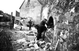 Die sogenannte Feierabendbrigade bei den Maurerarbeiten am Westgiebel