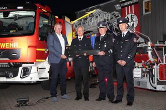 Gelebte Städtepartnerschaft zwischen den Feuerwehren Burg Stargard und Marne. Bürgermeister Lorenz Matzen, Wehrführer Nils Petersen (beide aus Marne), Wehrührer Frank Dielenberg und Sven Groneberg (beide FwFBurg Stargard) (v.l.n.r)