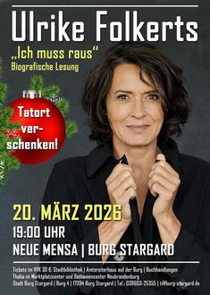 Ulrike Folkerts, dienstälteste Kommissarin der legendären Krimi-Reihe, kommt nach Burg Stargard und liest aus ihrer Biografie „Ich muss raus‘‘. Bereits seit 1989 ermittelt die in Kassel geborene Schauspielerin im Ludwigshafener Tatort als Lena Odenthal und sorgt mit ihrer grandiosen Darbietung für höchste Einschaltquoten. Nun können Sie Ulrike Folkerts live in Burg Stargard erleben. Gelesen wird am 20. März 2026 um 19 Uhr in der Neuen Mensa auf dem Schulgelände. Tickets für 30 Euro erhalten Sie in der Stadtbibliothek, im Amtsreiterhaus auf der Burg sowie in den Thalia-Filialen im Bethanien- und Marktplatzcenter.