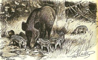 Bei Treibjagden sind Wildschweine eine beliebte Jagdbeute. Auf der Abbildung ist eine Bache mit Frischlingen zu sehen.