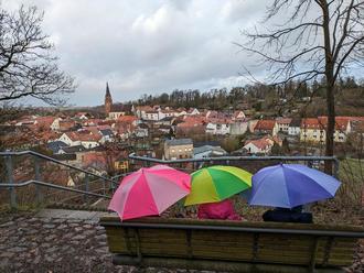 Apropos Farbfoto: Achten Sie bitte auf das schöne Bild mit den drei bunten Regenschirmen. Eigentlich wollte die Burg Stargarder Tagesmutti Fanny Gohrs mit den Kindern Ende Januar einen Spaziergang zum Louisenplatz machen. Doch es regnete. Getreu dem Motto „Es gibt kein schlechtes Wetter, es gibt nur schlechte Kleidung“ wurden kurzerhand die Gummistiefel angezogen, die Regenschirme geschnappt und der bunte Regenspaziergangsspaß mit wunderschönem Ausblick als Ziel konnte beginnen.