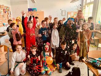 In der Grundschule "Kletterrose" wurde mit Konfetti und Kostümen Fasching gefeiert.