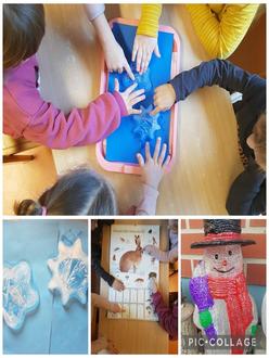 Da der Schnee noch fehlt, wurde kurzerhand selbst für Winterstimmung gesorgt: Schneebälle aus Papier wurden gebastelt, Fensterbilder gestaltet, fröhliche Schneemänner gemalt, die den Gruppenraum in eine winterliche Welt verwandelt hat. Auch draußen gab es einiges zu entdecken - welche Tiere sind auch im Winter unterwegs? Was fressen sie im Winter? Wie verändert sich die Natur?