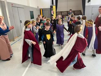 Gemeinsam mit den Schülerinnen und Schülern sowie den Lehrkräften wurde ein mittelalterlicher Tanz einstudiert und aufgeführt. Dabei standen Bewegung, Freude und gemeinsames Erleben im Vordergrund. Der Spaß war allen Beteiligten deutlich anzumerken und die Resonanz auf diese Aktion fiel durchweg positiv aus. Der Burgverein bedankt sich ausdrücklich bei der Grundschule „Kletterrose“ für die gute Zusammenarbeit und Unterstützung.