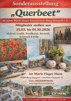 Am 15. März um 14 Uhr eröffnen wir im Marie Hager-Haus aus diesem Anlass die Sonderausstellung „QUERBEET“. Sie zeigt unter anderem Malerei, Grafik, Textilkunst, Schmuck und Keramik unserer Vereinsmitglieder, eine Menge Vereinsgeschichte und gibt Einblick in unser Vereinsleben.