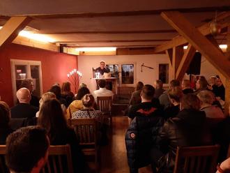 „Wahnsinn!“, „Großartig!“, „Einfach nur toll!“ Man musste das Publikum der ausverkauften Lesung des Game of Thrones-Schauspielers Tom Wlaschiha gar nicht fragen, wie sie es fanden, denn die Begeisterung stand den Besuchern förmlich ins Gesicht geschrieben. Zu Beginn des Jahres hatte Bibliotheksleiter Stefan Richert die Agentur des international gefeierten gebürtigen Sachsen angeschrieben. Kurze Zeit später kam die positive Antwort mit der Bitte nach einer kurzfristigen Terminfestsetzung. Innerhalb weniger Wochen wurde alles vorbereitet, innerhalb einiger Tage war die Lesung ausverkauft. 160 Besucherinnen und Besucher erlebten am Samstagabend, den 11.03., einen „Star zum Anfassen“. Nach einer kurzweiligen Zusammenfassung der Ereignisse, las Tom Waschihla aus einer Stelle des Romans „Das Lied von Eis und Feuer“, die er in der erfolgreichen Serie selbst gespielt hat. Gebannt lauschten die Besucher seiner weichen, dunklen Stimme. Schon in der Pause erfüllte der 49-Jährige Autogramm- und Fotowünsche und auch in der „Fragerunde“ im zweiten Teil des Abends zeigte er sich nahbar und bodenständig. So erzählte Tom Wlaschiha, dass er nach der Schule Schauspiel in Leipzig studierte, dann am Theater in Dresden spielte und mit ersten kleinen Rollen im Fernsehen Filmluft schnupperte. Mit dem Eintritt in eine internationale Schauspielagentur und das Angebot, in „Game of Thrones“ eine Rolle zu übernehmen, kam der Durchbruch. Tom Wlaschiha erzählte vom Arbeitsalltag eines Filmschauspielers, lange Wartezeiten am Set, verrückten Castings und den Tricks der großen Hollywoodproduktionen. Im Anschluss nahm sich der Schauspieler wieder viel Zeit für Fotos und Autogramme. Die Lesung war ein gelungener Auftakt der Burgsaison 2023.