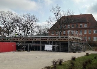 Parallel hierzu laufen auch noch die Bauarbeiten an der Sporthalle der Regionalen Schule. Hier werden aktuell die außenstehenden Holzträger verkleidet, was zum Glück jedoch keinen Einfluss auf den täglichen Schul- und Sportbetrieb hat. Ziel ist es, dass man die für die Statik des Gebäudes essenziellen Holzträger zukünftig besser vor Wind und Wetter schützen kann.