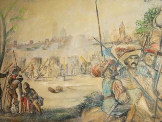 Ein Wandbild in der „Alten Münze“ zeigt die Beschießung der Stadt Neubrandenburg durch Tilly.
