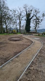 Trotz alledem ist jetzt schon zu erkennen, wie es mal aussehen wird. Auf dem vorherigen gepflegten Urnenfeld war nur eine ovalförmige Anordnung der Grabplatten möglich. Auf dem neuen gepflegten Urnenfeld gibt es mehrere Möglichkeiten. Zum einen die Beisetzung um den Trompetenbaum herum, der in der Mitte des neu entstanden Kreises mit Sitzmöglichkeiten entstanden ist, dann eine Beisetzung im ovalförmigen Urnenfeld (wie das schon bestehende gepflegte Urnenfeld neben der Kapelle) am Weg zum neu angelegten Kreis oder direkt am Weg entlang. Die Belegung wird wie schon vorher als Einzel- oder Doppelstelle möglich sein.