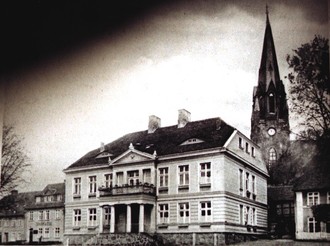 Das Haus war von 1833 bis April 1945 Verwaltungssitz. Für das 1758 abgebrannte Rathaus wurde 1832/33 ein neues erbaut. Es entstand nach Plänen von Baurat Buttel, im Stil der Renaissance. Eine doppelseitige Treppe führte zum Eingang, wie man auf dem Foto aus den 1940er Jahren sehen kann. Über dem Eingang war der Balkon, der von vier dorischen Säulen getragen wurde. Die Bürgermeisterei fand neben dem Amtsgericht Platz. Im Dachgeschoss war das Gefängnis, auf dem alten Kirchhof der Gefangenenhof. (Krüger) 1898 und 1935 hat man das Rathaus renoviert. (Kaeding) Zum Geschehen in den letzten Kriegstagen liegen verschiedene Quellen vor. Die erste Quellen-Aussage hält die Zerstörung des Rathauses und der fünf Häuser in der Nachbarschaft durch explodierende Panzerfäuste für möglich, die im Gebäude lagerten. Der Auslöser dieser Explosion soll eine Fliegerbombe gewesen sein. (Chronik Kaeding) Die zweite Aussage geht davon aus das das Rathaus unmittelbar vor dem Einmarsch der Sowjetarmee von faschistischen Bombenflugzeugen vernichtet wurde. (Festschrift 1959) Eine dritte Aussage hält es für möglich das in der Nacht vom 28. zum 29. April 1945 Hitlerjungen das Rathaus und angrenzende Gebäude in Brand setzten. (Rede 1975)