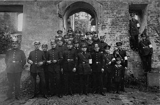 Die Stargarder Feuerwehrleute 1930 vor der Ruine des Krummen Hauses.