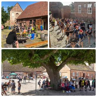 An diesem sonnigen Juni-Tag wurden die Kinder aus Neubrandenburg, Neustrelitz, Burg Stargard und Umgebung bereits am unteren Tor von unseren mittellalterlich gekleideten Burgführern empfangen. Nach kurzer Orientierung machten sie sich auf, die verschiedenen Stationen, wie Ponyreiten, Basteln, Bogenschießen sowie Spiele und Wettkämpfe zu absolvieren. Natürlich gab es wieder Knüppelkuchen am Lagerfeuer und die leckeren Waffeln des Heimatchors. Das Burggelände wurde ausgiebig erkundet und bot auch Anreize, der eigenen, kindlichen Fantasie ihren Lauf zu lassen. Das passende Equipment für „mittelalterliche Schlachten“ findet man natürlich bei uns im Burgladen. So viele Schwerter, Dolche, Schilde und Helme gingen in diesem Jahr noch nicht an nur einem Tag über den Ladentisch.