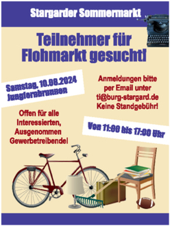 Am Fuße des Burgberges gibt es am Samstag Weiteres zu entdecken. Von 11 bis 17 Uhr findet rund um das Alte Hospital der Stargarder Sommermarkt statt. Verschiedene Händler mit regionalen Produkten, Keramik, Schmuck, Textilien und Buchwaren haben sich angekündigt. Begleitet wird das Ganze durch ein Musikprogramm am Klavier und einen Flohmarkt mit privaten Akteuren am „Jungfernbrunnen“. Wer Interesse hat, an dem Flohmarkt teilzunehmen kann sich gern noch anmelden unter ti@burg-stargard.de. Dabei geben Sie bitte den ungefähren Platzbedarf und die angebotenen Waren an. Standgebühren gibt es hier keine.