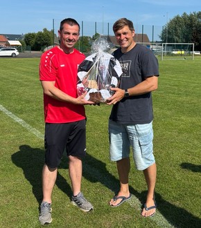 Mit einem Gastgeschenk aus Burg Stargard bedankte sich der SV 09 bei den Trainern und Spielern des Marner TV für die herzliche Gastfreundschaft.