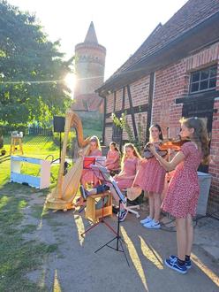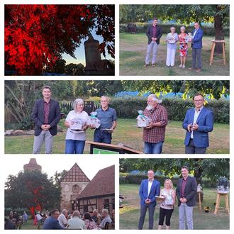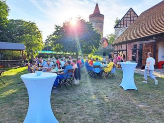 Für musikalische Sequenzen zwischen den Redebeiträgen sorgte Familie Irmer u.a. an der Harfe und Violine. Im wunderschönen Ambiente des Kräutergartens auf der Höhenburg Stargard wurden dann durch Bürgermeister Tilo Lorenz und Stadtvertretervorsteher Stephan Philipp verdiente Bürgerinnen und Bürger für ihr außerordentliches ehrenamtliches Engagement geehrt. Die erste Urkunde erhielt Christine Jähnert, die seit fast 40 Jahren im Heimatchor Burg Stargard e.V. hervorragende ehrenamtliche Arbeit als Vorstandsmitglied und Schatzmeisterin leistet. Außerdem spielt sie Akkordeon, hält den Verein zusammen und springt ein, wenn Not am Mann ist. Eine weitere Auszeichnung ging an Inge Düsing und Astrid Wolter. Wenn es um Gartenarbeit und die Verschönerung unserer Stadt geht, sind sie die beiden Expertinnen und unterstützen die Verwaltung tatkräftig bei der Pflege und Anlage von Pflanzflächen. Ihre Kompetenz ist auch in der jährlich einberufenen Rosenjury gefragt. Die dritte Ehrung erhielt der Stargarder Burgverein, der in diesem Jahr bereits sein 30. Jubiläum feierte. Bestimmte Personen haben einen großen Anteil daran, dass es den Verein und damit auch das Burgfest schon so lange gibt. „Wie nur wenige Leute stehen Frau Rita Lübstorf, Herr Wolfgang Dahlke und natürlich der Kastellan, alias Frank Saß für den Stargarder Burgverein und dessen Wirken“, wie Stephan Philipp in seiner Laudatio treffend formulierte.