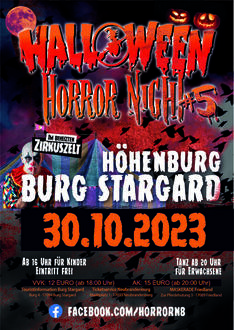 Es wird wieder schaurig-schön! Die alten Gemäuer der Höhenburg Burg Stargard werden in der Nacht vom 30.10. zum 31.10. von gruseligen Gestalten, dämonischen Geschöpfen und unheimlichen Kreaturen aus der Unterwelt heimgesucht. Das Event findet in einem beheizten großen Viermast-Zirkuszelt statt. Das Krumme Haus kann als Feiertempel momentan leider nicht genutzt werden, da dort Ausgrabungen von Toten vergangener Tage stattfinden, die in der besagten Nacht zum Leben erweckt werden. Werft euch in Schale, schminkt euch eine schaurig-schöne Fratze und nehmt am Kostüm-Contest teil. Es winken für die einfallsreichsten und kreativsten Kostüme tolle Preise. Der DJ und andere wahnsinnige Walk Acts werden das Zirkuszelt in einen Hexenkessel verwandeln, in dem altbekannte Hits der 80er, 90er & 2000er zum Besten gegeben werden. Neben gespenstischer Deko bereichern auch Händler und Schausteller die Burg. Eine Garderobe wird es im Zirkusvorzelt geben, um euren gruseligen Kostümen den letzten Schliff zu geben. Es werden außerdem genügend Speise- und Getränkestände vor Ort sein.