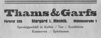 Stargard hatte um 1900 sowie in den 1920er und 1930er Jahren viele kleine Geschäfte und Läden, die meist private Einzelhändler betrieben. Bei der Durchsicht alter Fotografien im Chronikraum stieß ich auf dem Namen Thams & Garfs. Der Laden von Thams & Garfs befand sich in der Mühlenstraße 1. Bei einem Besuch in der Neubrandenburger Regionalbibliothek 2023 entdeckte ich den Namen Friedrich Garfs aus Brühl an einer Tafel der Sonderausstellung „Gemeinsinn und Nachhaltigkeit“ der Stiftung Mecklenburg in Schwerin die in Kooperation mit dem Landesnetz der Stiftungen in Mecklenburg-Vorpommern e. V. entstanden war. Ihm Rahmen dieser Wanderausstellung ging es um das kulturelle Erbe des Stiftens in MV.