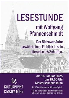 Zu einem Leseabend in Rühn mit dem Bützower Autor Wolfgang Pfannenschmidt lädt der Klosterverein Rühn herzlich ein. Der ehemalige Lehrer und Erzieher präsentiert einen Querschnitt seines Schreibens, darunter Texte und Gedichte sowie Geschichten, die er für Kinder geschrieben und illustriert hat. Wolfgang Pfannenschmidt ist unter anderem bekannt als Begründer und langjähriges Mitglied des Bützower Schreibzirkels „Bausteine“. Der Kulturpunkt findet am Donnerstag, dem 16.01.2025 um 19:00 Uhr in der Klosterschänke statt.