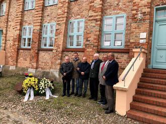 Ehemalige politische Häftlinge beim Gedenken vor dem Krummen Haus in Bützow beim 19. Häftlingstreffen 2023.