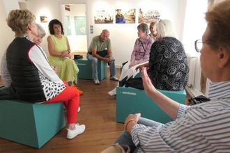 Birgit Czarschka (3. v. l.) war am 20. Juni zu Gast in der Ausstellung. In der Reihe Führung und Gespräch erzählte sie über ihr ehrenamtliches Engagement bei der Organisation der Helferinnen und Helfer.